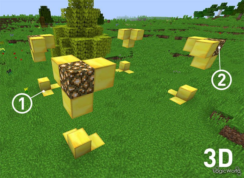 Если все сделано верно, то в оставшихся углах возникнет светопыль, а рядом и между ней блоки золота, указывающие на места прохождения ребер параллелепипеда. Их уничтожение не дает предметов. Через некоторое время, обозначение пропадет и заменится на исходные блоки. Для того что бы вновь включить выделение, нажмите ПКМ по блоку привата с лопатой в руке.